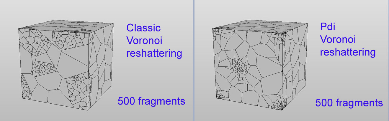 Conform Voronoi Reshatering: User is not longer constrained when reshattering a model, any shatter pattern can be added to the current set of fragments seamlessly, in addition new Conform Voronoi reshatering reduce the number of straight edges in the shatter pattern, hence improving the quality of the fragments generated.